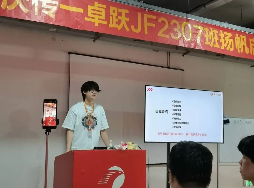 JF2307班正式开班啦!什么三伏天高温预警、什么“五湖四海”统统阻挡不了传一卓跃老师和同学们的亲切“会晤”。以独特的问候文化开场,同学们也展现了良好的精神面貌。这个7月,我们以传一卓跃为起点,开启一场快乐的编程之旅。